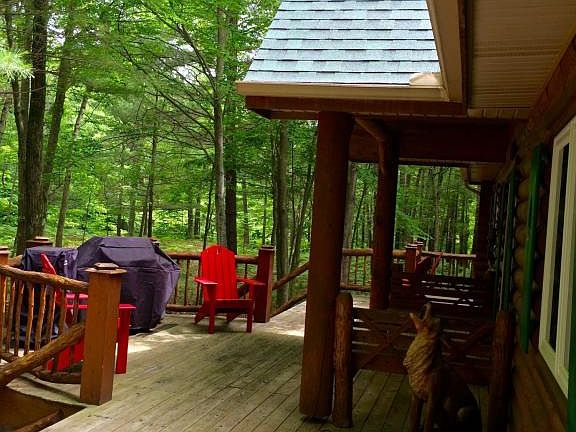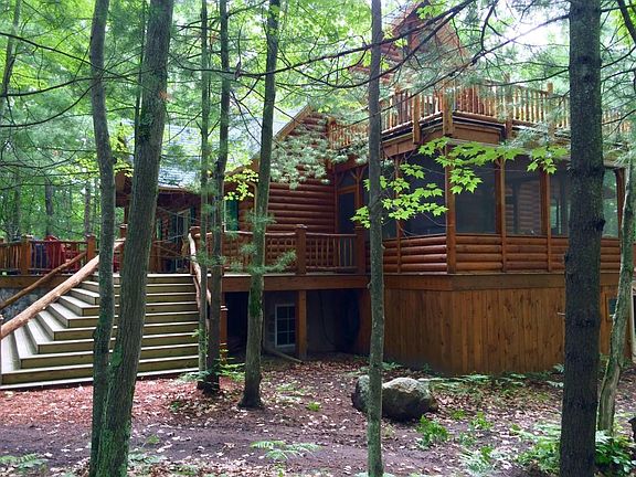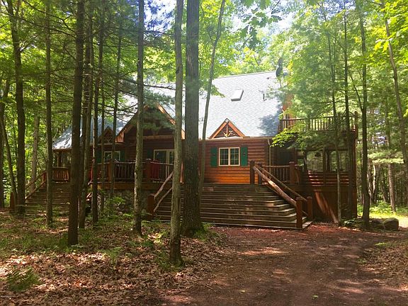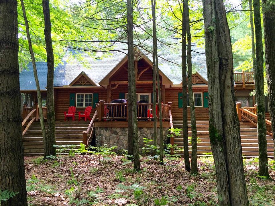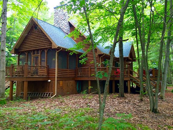 ACREAGE ADDED/PRICE REDUCED! Exquisite 3264 sq.ft. custom log home, wrap-around deck w/spectacular views of nature; screened-in porches on both sides of the home. 1474 ft Pere Marquette River frontage on 22.2A, ultimate fishing on PM designated Natural Wild & Scenic River. The main level includes a great room w/wood-burning stone fireplace, soaring ceilings, gourmet kitchen & high-end, stainless steel Jenn Air appliances, Italian tile flooring, Cambria Quartz counter tops, master suite,full bath & sauna to warm your bones on a cold winter's night. The spacious loft is ideal for additional sleeping or private sitting area. Finished lower level has a welcoming recreation room, two more spacious bedrooms,full bath & laundry room. Addtl smaller cottage on riverfront on 4A parcel included.