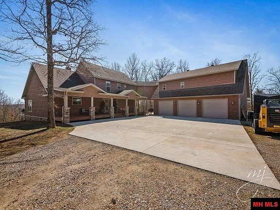 Magnificent country home nestled on 4 wooded acres m/l with Norfork Lake views & government strip frontage. End of the road privacy, but not too far from town and shopping. Beautiful design throughout including floor to ceiling stone fireplace in the living area. The kitchen has a massive amount of custom cabinet space & Cambria counters with stainless appliances, wine refrigerator, & ice maker. Heated and cooled 3 car garage will provide plenty of room for your lake toys!