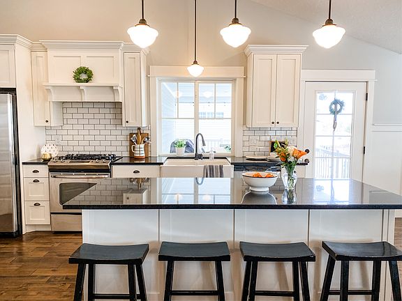 Beautiful 5 bed/3.5 bath home in quiet, friendly cul-de-sac. Gorgeous white kitchen in open main living area. Deep, large two-car garage. Master bedroom includes walk-in shower and walk-in closet. Two bedrooms upstairs. Full kitchen in basement. Large living area downstairs with two bedrooms. Covered front porch and upper and lower deck in back yard. Fully fenced backyard with two peach trees and three grow boxes.