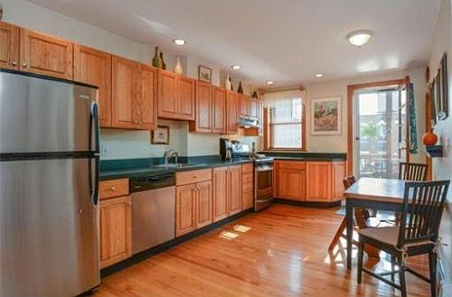 View website: http://697e8thst.NiceFamilyHome.com - Feel right at home the moment you walk in to this 1152 sqft, two bedroom, two bathroom condo in South Bostons desirable city point neighborhood. The kitchen is flooded with light, has stainless steel appliances and access to a private patio with southern exposure. The eat in Kitchen opens to the living room that has high ceilings, a marble fireplace, and a bow window. Full bath with in unit laundry are conveniently located on the first floor. Head up the stairway featuring exposed brick to the generous sized master bedroom with over sized windows and a second bedroom with an additional private deck. The third room is perfect for a nursery or office. Dont miss the desirable private roof deck with city and water views. This home is a commuters paradise and convenient to everything South Boston has to offer.