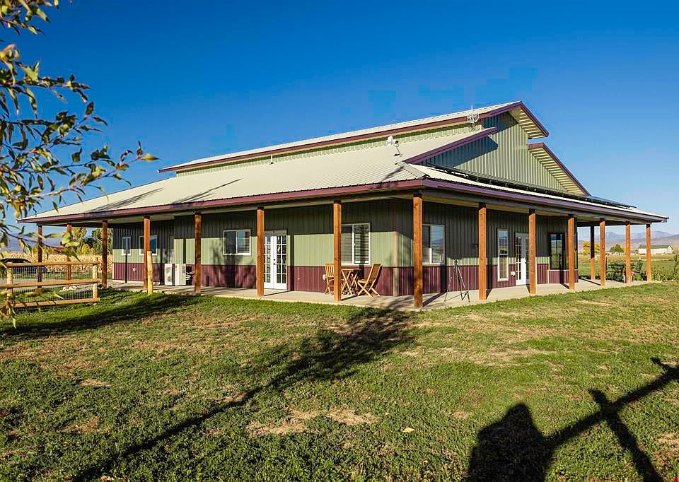 Experience relaxed country living with modern efficiency at this beautifully designed barndominium on nearly 10 acres in Delta’s desirable Ash Mesa area. Built in 2020, this thoughtfully crafted home blends open-concept living with accessibility and sustainability. The gourmet kitchen features granite counters, hardwood cabinetry, and stainless appliances, opening to spacious living areas with luxury vinyl flooring and wide views of surrounding peaks. The primary suite offers a spa-like bath with double sinks, jetted tub, and walk-in shower. Enjoy year-round comfort with an owned 4 kW solar array and on-demand hot water. Outdoors, a wraparound porch overlooks irrigated pasture served by UVWUA, plus a large barn, garden plot, and fencing ready for animals. An oversized three-car garage and two carports provide generous parking. Quiet rural setting just 10 miles from town...where tranquility meets modern convenience.