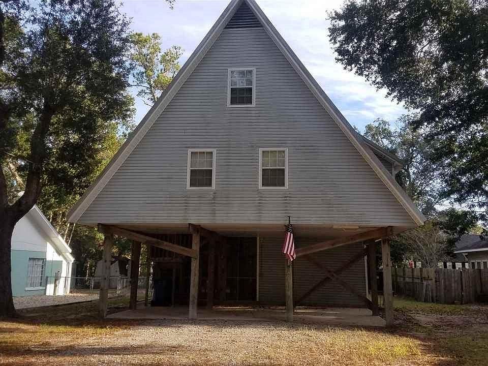Great 3 bedroom home close to the school, rec center, tennis, restaurants and more in East Orange Beach. The subdivision has a private boat launch, waterfront park and waterfront picnic area. Great place to watch the Christmas Boat Parade! Kitchen has eat in area for a table and a separate dining room. Den has great built in storage/book shelves and a wood stove ready for cool nights! Master bedroom is on the main level - bedrooms 2 & 3 are upstairs. Downstairs there's a screened porch, a full bath and a storage room that could easily be converted to an extra bedroom. Room underneath to park 2 cars. Separate storage building outside in the fenced in back yard. This house needs wallpaper removal and paint - it's waiting on your special touch! Don't miss this property in East Orange Beach!