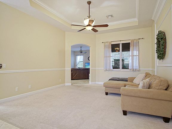 You'll love the floor-to-ceiling amenities this corner lot home has to offer. Step inside and enjoy 10' ceilings throughout, a formal dining room with custom wall accents, and loads of natural light in every room. The kitchen dazzles with stunning granite countertops, a convenient breakfast bar, and a spacious pantry that every kitchen deserves. This home boasts two family rooms and the wow factor is on full display with the custom coffered ceiling with crown molding inset. The oversized master bedroom allows for plenty of space, not to mention the dual walk in closets with organizers. The master bathroom gives everyone their space with two separate vanities and a large soaking tub. Personally, my favorite part would be relaxing in the covered, screened back patio while watch a beautiful sunset. Other amenities include storage shelves in the garage, a 5-zone sprinkler system on well water, gutters, and a large concrete pad for RVs, boats, or trailers. Seller is offering an $18,000 credit for a new roof.