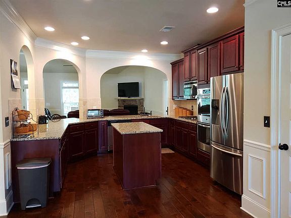 - RoomKitchenFeatures: Granite Counters, Kitchen Island, Pantry, Recessed Lighting, Eat-in Kitchen, Floors-Hardwood, Cabinets-Stained, Bar, Backsplash-Other