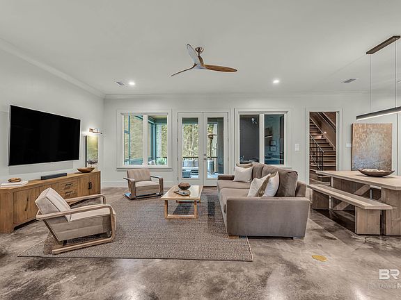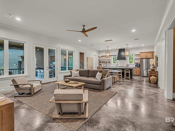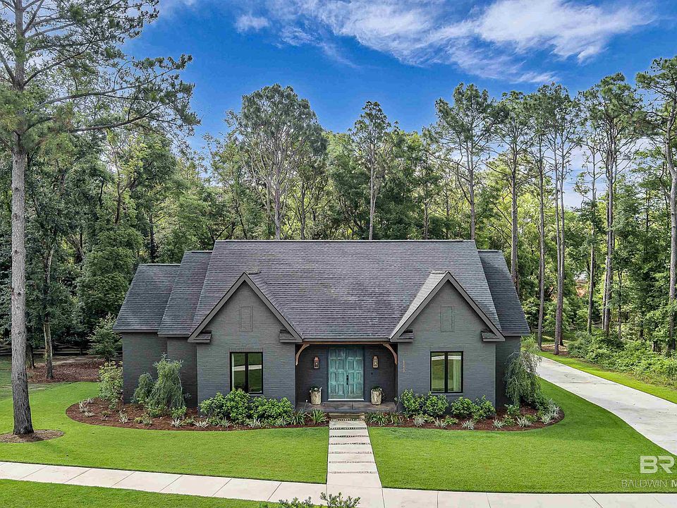 This striking 3-bedroom, 3.5-bath home (+ office) offers a stunning blend of modern flair and timeless elegance. Wrapped in sleek black brick, this residence stands out from the moment you arrive. A patina-distressed front door flanked with gas lanterns welcomes you into a 6x8 formal foyer with stunning grass cloth wallpaper and designer light fixture. The thoughtfully designed interior boasts 10-foot ceilings, recessed lighting, and marbleized stained concrete floors throughout the main level. The open-concept layout connects the kitchen, dining, and living areas in a warm and cohesive space. The kitchen features a sizable island, floating shelves, gas range with custom hood, breakfast bar, and an expansive pantry—designed to inspire both daily living and entertaining. The split-bedroom plan offers privacy, with a stylish color-drenched primary suite that includes a luxurious en suite bath with double vanities, a freestanding soaking tub, separate shower, and a walk-in closet that incorporates the laundry area and a utility sink. Across the hall from the primary suite is a spacious office with its own closet. Travel up the wide wood-tread staircase to find the adorable 3rd bedroom with hardwood floors, additional private bath and walk in attic access. Entertain your guests on the expansive 14x19 screened back porch, where you can relax in comfort while enjoying the peaceful backdrop of the wooded landscape just beyond your backyard. Just inside, a custom wine rack offers a charming spot to showcase your favorite vintages—perfect for pouring a glass before stepping out to unwind. Nearby, a stylish half bath with designer finishes provides easy access for guests, blending convenience with flair. Located in the charming Hilltop neighborhood—just a short golf cart ride to downtown Fairhope and walking distance to Dragonfly Food Bar and a future wine and coffee bar. Additional highlights include irrigation system and a 5x12 heated/cooled storage room off the garage. Buy