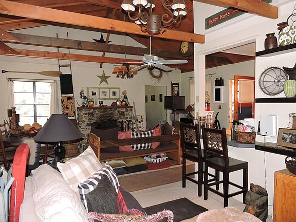 - Interior Features: Ceiling Fan(s), Counters-Laminate, Live on One Level, Master On Main, Raised Ceilings 9+ft, Beamed Ceiling, Fireplace-Woodburn