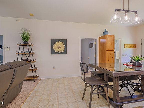 Inside, the single-level layout is thoughtfully designed for easy living. The living room is bright and welcoming, with dual-pane windows that enhance the home's efficiency and comfort. The dining area provides a cozy setting for meals, seamlessly connecting to a well-equipped kitchen with abundant cabinet space. Each bedroom offers a peaceful retreat, with windows that frame the serene outdoor landscape, allowing you to enjoy the natural beauty from within.