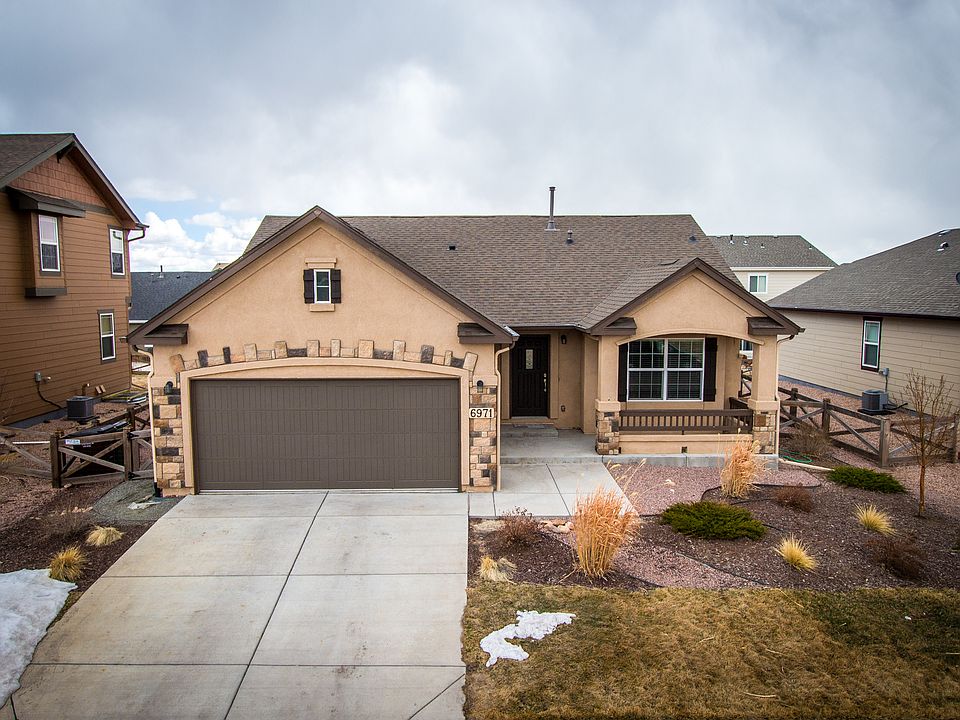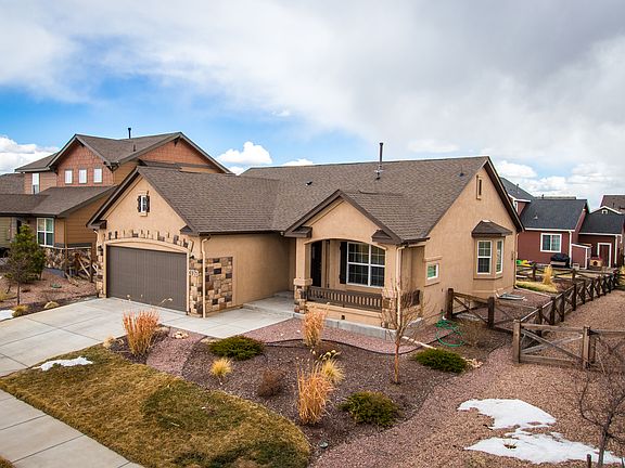 Beautiful Ranch home located in Banning Lewis Ranch* Great location with easy commute to the Powers corridor* The neighborhood is full of green areas, parks, pool, rec center, and its own Charter school* This home has many upgrades over the standard builder grade* Full stucco and stone exterior will provide easy maintenance for years to come* Whole house does have Central air which will come in handy during our hot summer months* Out front you have a quaint covered patio to relax on* As you walk inside you will be greeted with gorgeous hardwood floors that flow throughout the entry to the living/dining rooms* An open concept is what makes this floor plan great with tall vaulted ceilings over the Living room space* The living room also has a cozy fireplace to nestle around* The Dining room has a breakfast counter bar between the kitchen and there is also a bay window for that extra space* Kitchen is a chef's dream with a gas stove, Granite counter-tops, and plenty of pantry storage space* There are 2 bedrooms on the main level* The Master bedroom has vaulted ceilings and adjoins to a walk in closet and 5 piece bath with double vanity and a soaking garden tub* There is another full bath in the hallway for the 2nd bedroom to use as well as guests* The basement is fully finished* The family/rec room is perfect for entertaining with a wet bar and plenty of space for an entertainment center* There are another 2 bedrooms making this a 4 bedroom home and a full bath downstairs for the rooms to share*