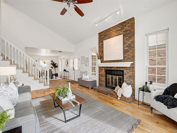 Welcome Home! Sunny vaulted end unit with a main floor primary bedroom featuring: Wood flooring on the main level, spacious living room with a gas fireplace, dining area and a nice kitchen with all appliances included! There is an abundance of storage and also a hookup for a washer/dryer on the main level. Upstairs features a flex space for an office or TV area, another large bedroom and a full bathroom. The home has newer windows, new interior paint, tons of storage and a space that is already converted to an optional laundry area. The full basement is unfinished, with a laundry area and a radon mitigation system in place. There is a lovely covered front porch and a nice deck off of the back that backs to a greenbelt area. The two car detached garage is just steps away from the townhouse. There are tennis courts and a pool and easy access to the willow creek trail system and open space.