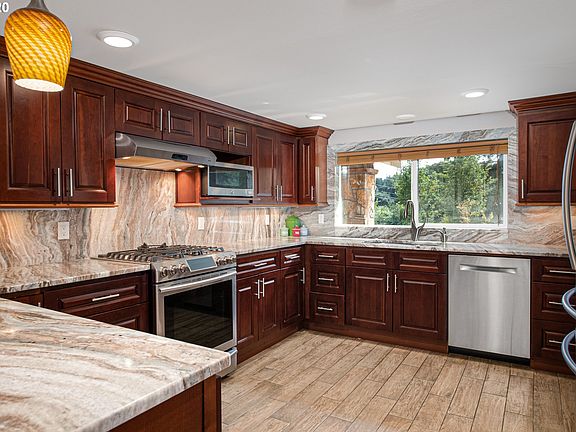 Welcome to an incredible venue to entertain outside and enjoy a park-like setting! Beyond the gated entry is the most incredible display of professional landscaping with a water feature, flagstone walkways, patios, yards, flowers, fruit trees, and walkways. Completely remodeled interior includes floor to ceiling marble showers, granite windowsills, and extensive use of tile. The outbuilding/shop is 60'x30' with multiple uses possible. Shy 2+/- acre property could also be used for equestrian