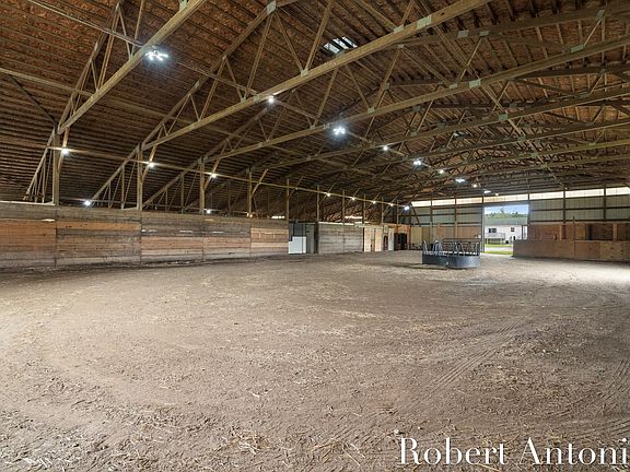 Additional features of the estate include a pond, fruit trees, fenced arenas, well-maintained trails, and exquisite landscaping. Inside the barn, one will find an indoor arena, cement flooring, an office, with kitchen area, a tack room, and free-standing horse stalls. Furthermore, the barn is equipped with a full wash rack featuring a drain and hot and cold water supplies.