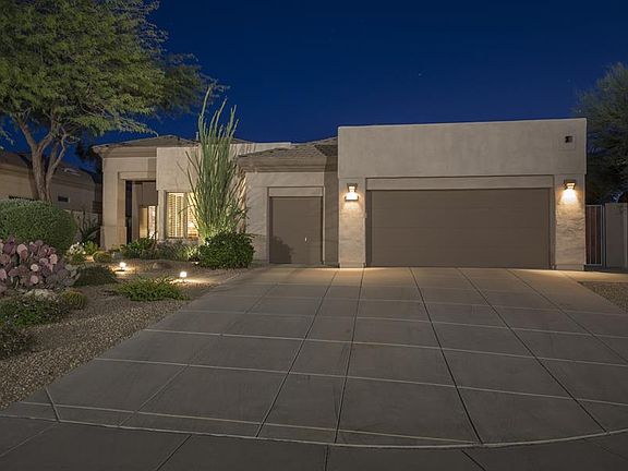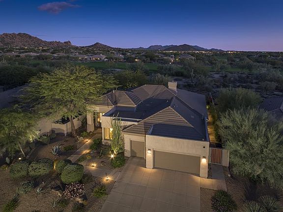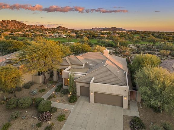 Awesome COMPLETE REMODEL on a Spectacular site with private,quiet, BACKYARD MOUNTAIN GOLF COURSE AND SUNSET VIEWS.Inside living:SOLID KNOTTY ALDER CABINETS with side panels and undercabinet lighting,18" TUMBLED TRAVERTINE FLOORS and tub/shower surrounds, gorgeous SLAB GRANITE in kitchen baths & laundry,Brushed nickel hardware and fixtures,framed mirrors,plantation shutters,sound system throughout,En SUITE BATH in bed 2,great builtins in bed3/den. OUTDOOR LIVING:Oversized backyard has completely private huge southeast sky views for the day then after watching the sunset grill at the outdoor kitchen and dine on huge patio area.Cook smores cooked over the firepit and hop in the HEATED NEGATIVE EDGE SPA or just enjoy the sound of the natural boulder water feature.FURNITURE AVAIL BY SEP AGREE