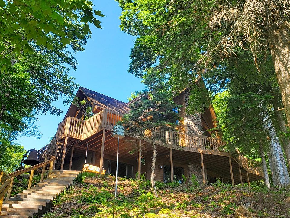 FISHER LAKE CHALET - This is a legacy parcel. If you want to get away from people and chaos with zero neighbors on a fully recreational and fishing lake this will be heaven for you. This is a rarity, 25 ac of land on a point with 2600 ft. of sand frontage on 452 acre Fisher Lake on 3 lake chain. The property abuts county land so there's privacy and room to roam. The house has plenty of room and comfort you will not want to leave. Enjoy the panoramic view through the wall of windows as Fisher Lake is on all 3 sides. The sunroom with all the windows facing the lake will be your favorite room in the house. The house has a full true fieldstone fireplace that reaches floor to ceiling, large 3 car attached garage & wrap around deck for a full spectacular view of the lake. It has all you'd expect: huge loft master bedroom, full walk-out basement and open floor plan with peaked ceilings.