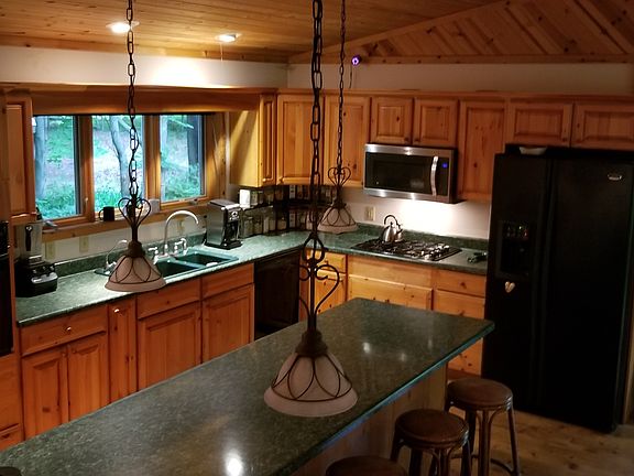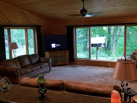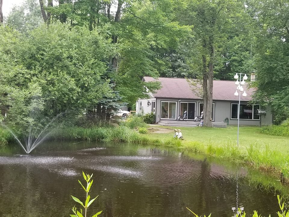 You'll feel right at home in this lovely country home with 330ft of frontage on Round Lake and 6 acres. Private wooded setting with pond, fountain, garden area and fire pit for outdoor fun. Open floor plan with vaulted ceiling and knotty pine tongue and groove. Large kitchen and center island with snack bar and pantry. Master en suite with Jacuzzi tub and on demand hot water. A four season room to enjoy the breeze and watch the wildlife or to use as a bedroom. 36x52 4 stall garage, w/110 electric, finished, insulated and heated, with rec and work shop areas. 16x12 She Shed (used as a wood carving shop, could be additional bedroom). Car port for your RV w/220. Whole home generator for home and garage. Fish, swim or kayak on the clean clear lake.