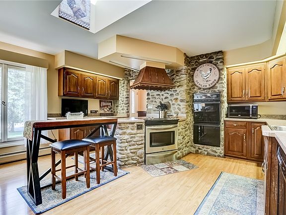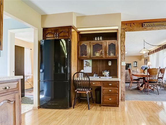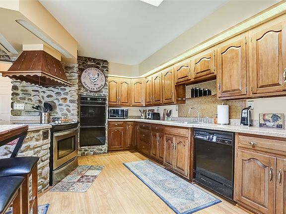 Welcome to this spacious custom Ranch home offering so many amenities. As you enter you see the amazing kitchen with loads of cherry cabinets, dual ovens, loads of counterspace and a built-in desk area. The dining room has a cobblestone fireplace, barnwood and wood beams, the floor plan is open and spacious with a large Livingroom. Two of the bedrooms are separated by a barn door offering complete privacy from your living area. Step through your double French doors into your cozy family room with wood burning stove, windows overlooking your private yard and Access to your lower level which has been professionally waterproofed offering Bilco doors to the backyard. Off the kitchen you will find a 1st floor laundry, full bath and an additional bedroom perfect for guests or an office. You will love the privacy of this home. Oversized 2 1/2 car garage and shed add to the exterior features. Delayed showings until 4/20/23, delayed negotiations until 4/24/23.