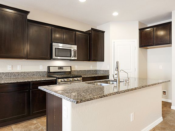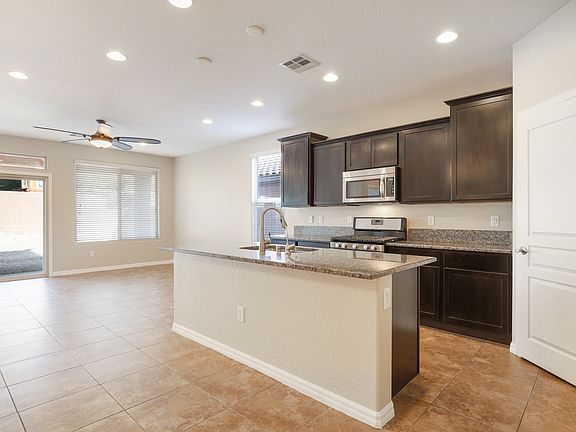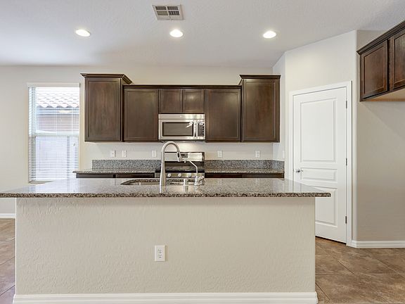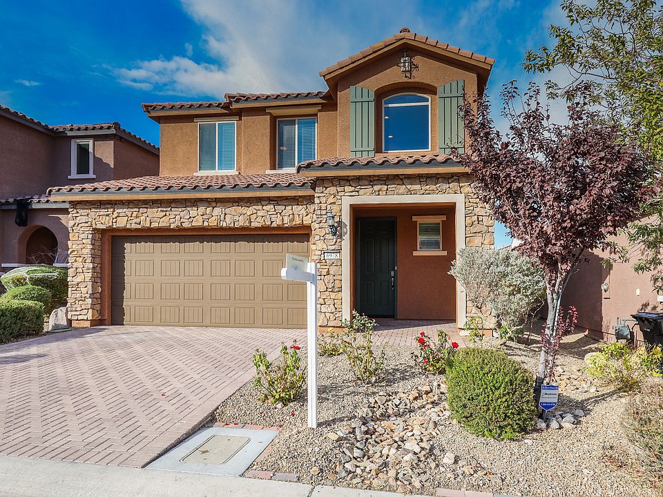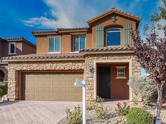 Fantastic two-story home with master suite on the main level located at Mountain's Edge. This home features 4 bedrooms, 2.5 bathrooms, 2-car garage, with 2,336 square feet of living space. Wonderful curb appeal with the beautiful stone facade, stone-paved driveway, and walkway inviting into two-story foyer revealing an open layout floorplan and a modern style open wood and metal staircase upgraded railing. Ahead is an archway hallway leading to the spacious family room with lovely neutral tile flooring which is open to the kitchen, adjacent to the dining area and it is great for entertaining. Beautiful kitchen boasts dark espresso cabinets finished with crown molding, gorgeous granite countertops, upgraded stainless steel appliances, island and breakfast bar, and a pantry. Owners suite downstairs offers a walk-in closet and master bathroom with dual sinks, solid surface countertops, tub, and a separate walk-in shower. Secondary bedrooms are upstairs plus an oversized loft for additional living space, game room or a media room. Backyard is a blank canvass and ready for your finishing touches. Home is perfectly situated in a beautiful neighborhood with easy access to Blue Diamond Rd and newly developed shopping plazas and entertainment. Contact us NOW for further details and viewing appointments. Zillow Inc. has a real estate license in this state.