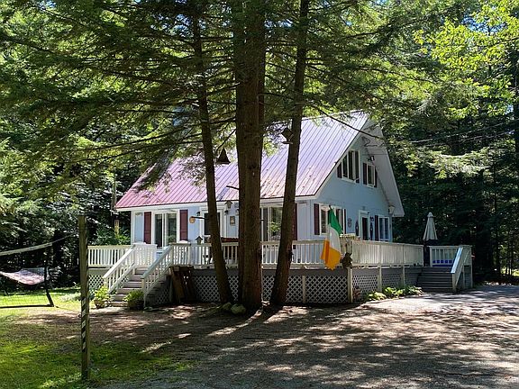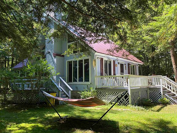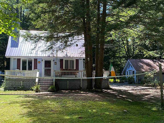 TRADITIONAL SKI CHALET LOCATED ONLY A FEW MILES FROM KING PINE SKI AREA AND OSSIPEE LAKE IN FREEDOM, NH. The home is set on a wooded 2.25 acre lot, which abuts a 23+ acre, town-owned, undeveloped parcel of land where native brook trout hide in a series of beaver ponds and the deer and the birds play. Home features a first floor primary bedroom, full bath and laundry, kitchen open to the dining and living room, and large living room with functional brick fireplace with woodstove insert and vaulted ceiling with exposed beams. There is even a fully enclosed porch, heated and useable year round that can add extra sleeping space, if needed. Upstairs is a small loft plus a second bedroom and ¾ bath. Large wraparound deck plus a private rear deck with its own fireplace that looks out into the woods. There is also a small insulated and heated guest house, that could hold a spare bed, that is now set up as a gaming room for all. Property comes partially furnished at no cost. Four season enjoyment from skiing at King Pine, to cross country skiing on the abutting forest, to snowmobiling at your doorstep, to access to both Ossipee and Loon Lake plus the Ossipee River. An active person’s dream location. Short term rentals allowed. Seller to install a NEW state-approved septic system prior to closing.