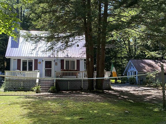 TRADITIONAL SKI CHALET LOCATED ONLY A FEW MILES FROM KING PINE SKI AREA AND OSSIPEE LAKE IN FREEDOM, NH. The home is set on a wooded 2.25 acre lot, which abuts a 23+ acre, town-owned, undeveloped parcel of land where native brook trout hide in a series of beaver ponds and the deer and the birds play. Home features a first floor primary bedroom, full bath and laundry, kitchen open to the dining and living room, and large living room with functional brick fireplace with woodstove insert and vaulted ceiling with exposed beams. There is even a fully enclosed porch, heated and useable year round that can add extra sleeping space, if needed. Upstairs is a small loft plus a second bedroom and bath. Large wraparound deck plus a private rear deck with its own fireplace that looks out into the woods. There is also a small insulated and heated guest house, that could hold a spare bed, that is now set up as a gaming room for all. Property comes partially furnished at no cost. Four season enjoyment from skiing at King Pine, to cross country skiing on the abutting forest, to snowmobiling at your doorstep, to access to both Ossipee and Loon Lake plus the Ossipee River. An active persons dream location. Short term rentals allowed. Seller to install a NEW state-approved septic system prior to closing.