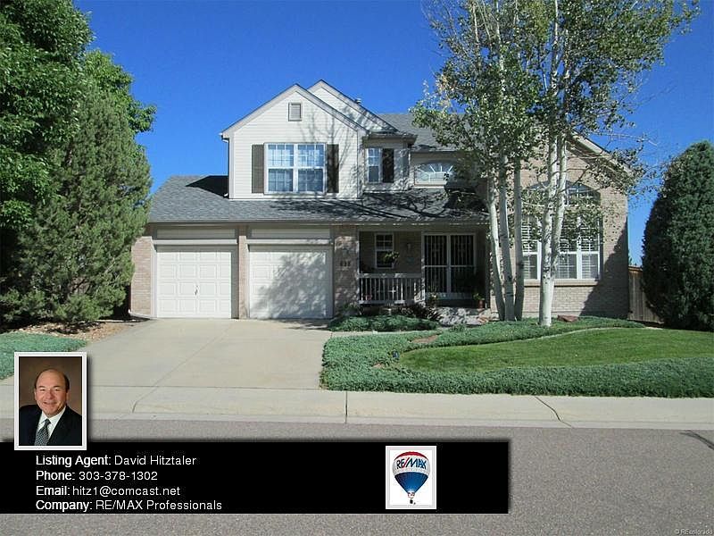 When only the BEST will do! You can STOP looking! This Highlands Ranch 2-story is the perfect family paradise. 4 generous sized bedrooms on the upper level including a master suite with 5 piece bath, walk-in closet and beautiful mountain views. The main level features a formal living and dining room with plantation shutters, family room with gas log fireplace and a large, updated kitchen featuring slab granite counters, tile backsplash, SS appliances, island counter and eating space. This home has had a lot of TLC and is in pristine condition. Additional features include extensive hardwood flooring,attic fan, central air. Compare prices and you'll see that this home could quite possibly be the home your heart has been aching for! Covered front porch, large custom deck with lighting and very nice mountain views, sprinkler system, stamped, concrete patio and professional landscaping further compliment this outstanding home. WOW! It simply doesn't get any better than this. Listing Agent: DAVID HITZTALER Company: RE/MAX PROFESSIONALS Phone: 303-378-1302 Email: hitz1@comcast.net