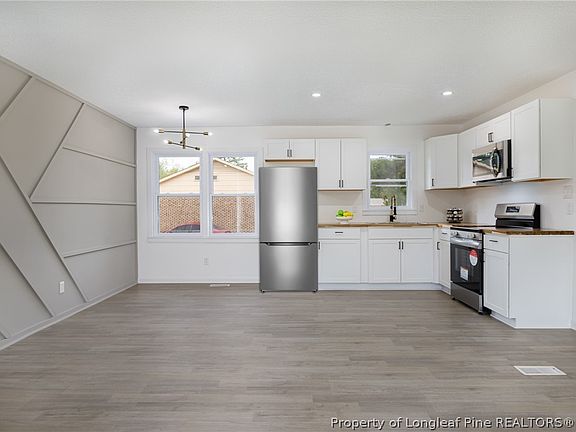 Incredible renovation! Located on a big corner lot convenient to I-295 and Fort Liberty. All new windows, HVAC & ductwork (2023 condenser model), 50 gallon water heater, flooring, paint, cabinets, appliances, fixtures, Shaker doors, vanities, and toilets! Eye catching kitchen is all new with SS appliances, LVP flooring, butcher block countertops, recessed lighting, and accent wall! A similar SS fridge will be delivered as seen in the pictures. Stunning vanities in both bathrooms. Pretty brick veneer, front porch, fresh landscaping, and fenced in back yard. You have to see this remodel in person to appreciate it!