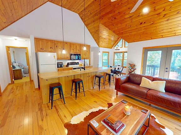 Soaring decks, treetop vistas, a screened porch-and that's just the beginning! Many wrap around decks. Architectural shingle roof. LONG mountain views in winter and summer if you cut some trees. Open living room with wood burning stove, High cathedral wood ceiling LR & BRM. Cook and chat with guests, huge island kitchen with double-sink island. Two carpeted master suites, one downstairs and one up; upper level has spacious walk-in closet and laundry nook with Washer & Dryer included. Angelico Gap has paved roads and great access to Blue Ridge. Includes garage with workshop area. BIG VIEWS can be opened up by removing trees. Come see this and know you're home! Home is Furnished!