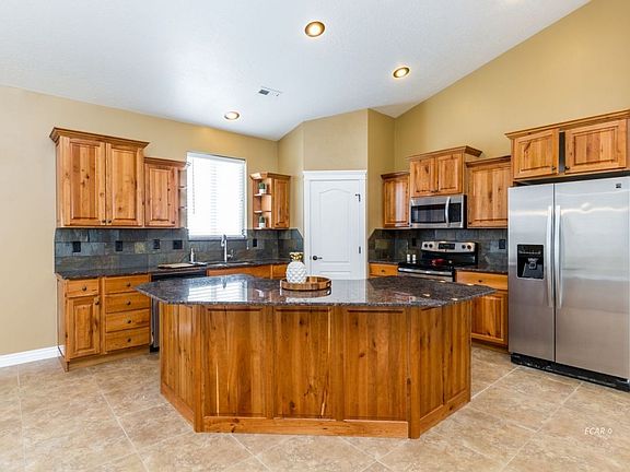 This nearly new Beck home is the Overton model featuring a split bedroom floor plan with 9ft vaulted ceilings, open concept floor plan with a private master suite. The kitchen features a center island, knotty cherrywood cabinets and granite counter tops. The master suite has a walk in closet, large soaking tub/shower with tiled walls and a double sink vanity. The view from this lot is exceptional of the Ruby Mountains.
