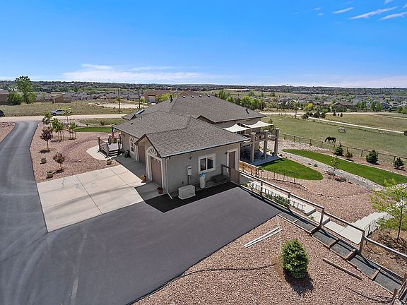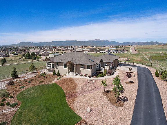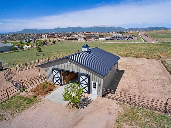 This stunning 4,572 SF rancher offers 4 beds+office, 3 baths, 3 car garage, 4 stall barn, quality upgrades everywhere, 4.75 acres, w/Colo Springs shopping, hospitals, airport gyms, &AFBs at your fingertips. Powers Boulevard is just 5 minutes away! The home's many upgrades include open-concept living, main level living, 3 gas fireplaces, spacious office w/closet, hardwood &24" tile flooring, granite countertops, gourmet kitchen, huge deck with phenomenal Pikes Peak &Front Range views &more! The basement provides 2 secondary bedrooms, full bath &huge family/rec room w/wet bar, sound system, a walkout to covered patio & backyard, &huge storage room. The insulated Morton, 4-stall barn was built in 2010 &features water, electricity, a tack room & storage loft. Completing this home as a true horse-property is the perimeter-fenced (plus electric tape) lot w/3 pastures. Final upgrades to the property include a propane fueled generator, 2 furnaces, 2 ACs & humidifiers, & 2 hot water heaters.
