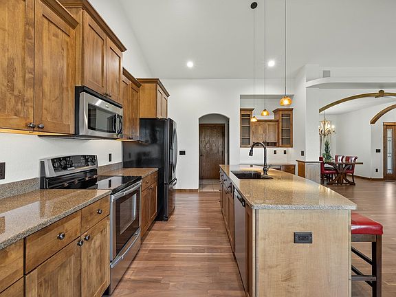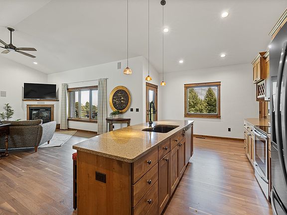 Listed by Arlyn Dyce, KW Realty Black Hills, 605-209-1637. Beautiful Home in Red Rock Estates, 3956 Square Feet, 5 bedrooms, 3.5 baths, 3 car garage, .43-acre lot, overlooking the 11th Green of Red Rocks Golf Course. This home is an absolute gem. Beautiful Alder doors throughout, Alder Cabinetry, solid Black Walnut floors on the main level, Quartz counter tops and under counter lights in the kitchen, main floor laundry, formal dining area, gas fireplace and open floor plan. The master en-suite offers a jacuzzi tub, walk in shower and walk in closet. Main level has built in 5 channel surround sound system that can be enjoyed in the in the main living area, master bedroom, back deck and garage. 21x13 Covered deck to sit, relax and enjoy the view just off the kitchen. The lower level offers 2 bedrooms, 1 bathroom, open concept with lots of light and a walkout to the back yard. The lower level was completely remodeled 2 years ago, new paint, electrical, lighting, and flooring. New roof in 2019 with Armor Shield Class 4 impact resistant shingles. CALL VICKI to schedule a showing 605-219-5234.