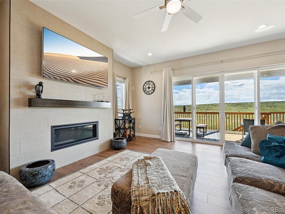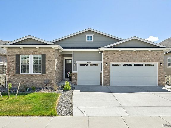 Welcome to Serenity! A place to call home, a place to relax and live well. Three of the 5 bedrooms and four of the 5 bathrooms are on the main level. The first bathroom, as you enter the home, is upgraded with double sinks and has a bedroom on one side and an office on the other. This exquisitely crafted open concept offers an incredibly smooth flow throughout this ranch-style home with a full basement. The gathering place kitchen has an oversized island with seating for 5 and is equipped with top-of-the-line GE Monogram Appliances for efficiency and elegance. A luxurious primary bedroom with 2 walk-in closets, an upgraded tub and a shower. The spacious dining area and living room lead to a beautiful covered patio with a view of the Aurora Reservoir. This Serenity House has a myriad of premium upgrades: kitchen cabinets and appliances, faucets and showerheads, one panel doors, window wells, backyard landscaping, fence, whole-house humidifier, exterior of fireplace, gas line, rough-in build-out for bar/kitchenette and so much more.