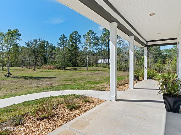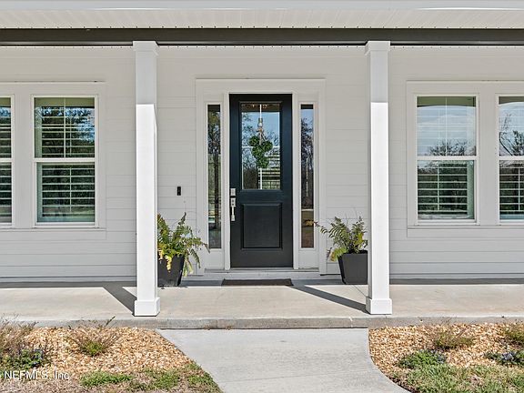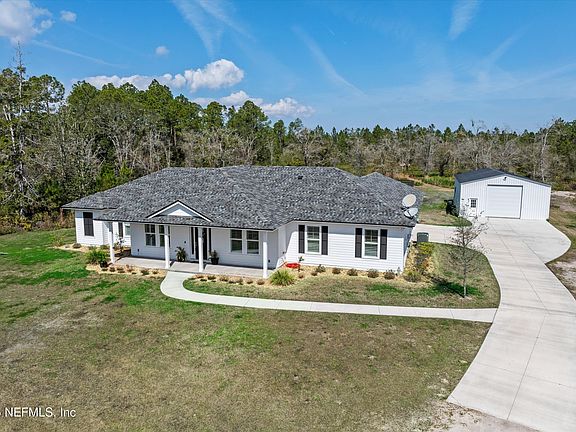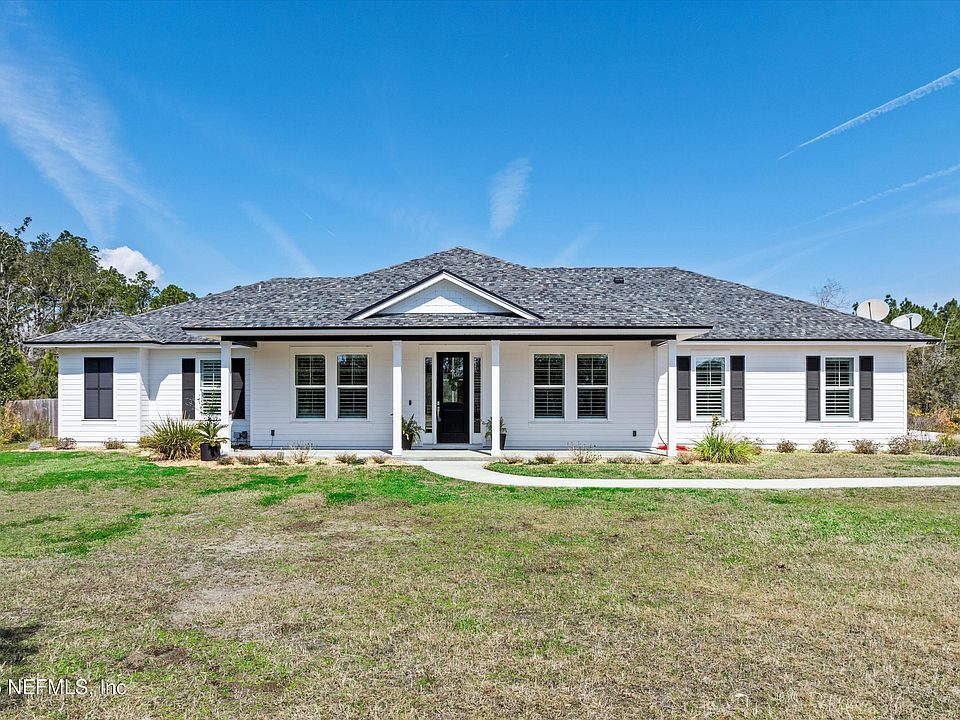 Experience the perfect blend of elegance, comfort & freedom in this stunning single-story, 4-bedroom, 2.5-bathroom luxury home with a dedicated office, nestled on nearly 10 acres in St. Johns County! Bring your horses, RV, boat, ATV's & other toys as there's room for all. This beautifully designed custom-built home boasts an open floor plan with soaring vaulted ceilings and high-end finishes throughout. Plantation shutters, luxury vinyl flooring, 7'' baseboards & 8' interior doors throughout. Designed for both privacy and functionality, the split floor plan ensures a seamless flow between living spaces. The chef's kitchen is the heart of the home to gather & enjoy friends & family. The updated bathrooms add a modern touch, while the owner's suite offers a spa-like retreat with an ensuite bath complete with a gorgeous claw foot soaking tub, separate walk-in shower, dual vanities, and two walk-in closets. Step outside to your private oasis, where a large covered custom-built screened salt water pool & summer kitchen invites relaxation and outdoor enjoyment.