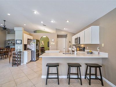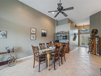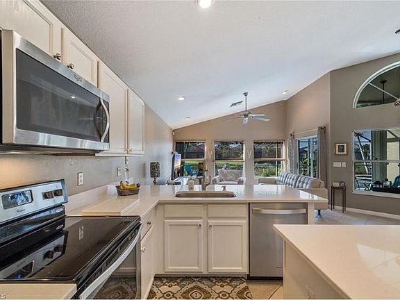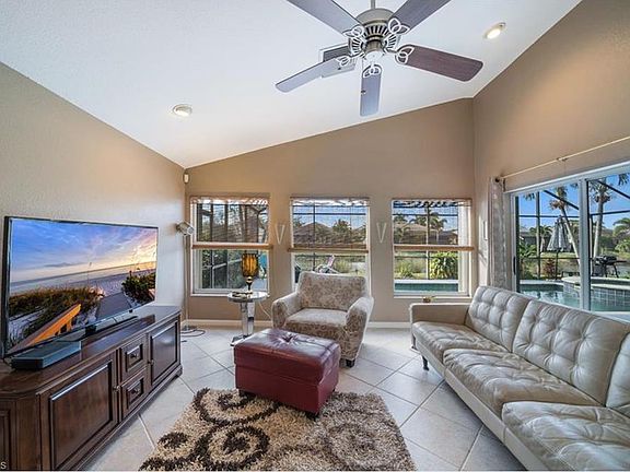 Located in the highly desirable community of Autumn Woods, this meticulously maintained, southern exposure pool home offers natural sun light from every room. Upon entering, you are greeted by soaring ceilings, spacious formal living room, and a view of the pool and lake. The kitchen is equipped with quartz countertops, an abundance of cabinet space, and a useful pantry. Along with a dedicated dining room, the living/family room offers plenty of space for family and friends, and is equipped with volume ceilings and windows on every side. This popular Papaya floor plan also allows separation from the master bedroom and 3 guest bedrooms. Outside, a convenient heated pool and spa are an added bonus, while a covered lanai looking over the pool area is perfect for relaxing and looking at sunsets. Updates include new HVAC, new pool heater, new irrigation, fresh paint, new landscaping, and new light fixtures. Community amenities include swimming pool, spa, tennis courts, basketball court, playground, fitness room, and two meeting/activity rooms. A convenient 24 hour guarded gate allows for security. Autumn Woods is located in a coveted school district in Naples. Furniture negotiable.