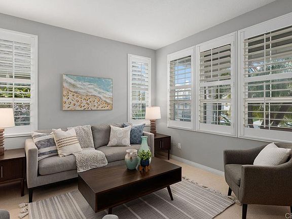 Coastal living at it's finest! Welcome to the gated beach community of Waters End. One of the larger floor plans, this open concept 4 bedroom 4 full bath home is a rare opportunity.The gourmet kitchen features granite countertops, oversized island with induction cooktop, custom cabinetry and built in bar with wine fridge.The adjoining family room has built in entertainment center with surround sound and gas fireplace. Wood floors throughout the downstairs, plantation shutters in living room, bedrooms and loft area. Upstairs oversized primary bedroom/bath with dual sinks, soaking tub, separate shower and walk in closet with built-ins. Additionally there are two secondary bedrooms upstairs (one ensuite) and open loft area which could be converted to 4th bedroom. Conveniently located upstairs, the laundry room(with sink) plus a bonus office space which is ideal for remote work. Enjoy your private tropical backyard with lava rock waterfall koi pond, fire- pit, built-in bbq island with granite counters, outdoor shower and palapa. Located within the top rated Carlsbad School District, close to restaurants, shopping, and the Poinsettia Coaster station.This fantastic neighborhood has resort style pool & spa with BBQ area, playground, basketball court, dog park, RV lot and plenty of grassy area to play. Walk to the beach and enjoy the new camp store with live music and great food. Do not miss this rare opportunity to live in this wonderful beach community.