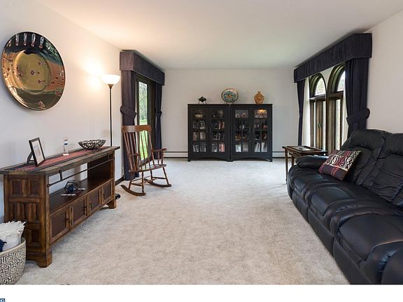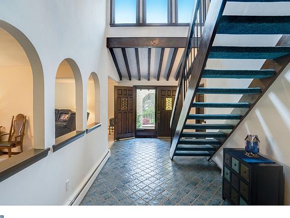 Custom built Spanish style villa on over 2 beautiful and private acres on sought after Ely Road in Solebury. This lovely 4 Bedroom, 2.1 Bath Home is set back from the road up a long circular driveway with beautiful professional landscaping. A paver walk way leads into the entry with a high ceiling, a blue American Olean, Andorra tiled floor and is open to the 1st level. The sizeable formal Living Room has 2 large circle topped windows and a sliding door out to a side breezeway patio that connects to the Kitchen. The Formal Dining Room has an arched wall that opens to the Family Room. The Kitchen is very spacious with ample custom cabinetry, tile backsplash, eat-in bar, built-in desk, stainless fridge and breakfast room with access to the side porch. Step down into the cozy sunken Family Room, it offers a beamed ceiling, newer hardwood floors, a beamed mantle over the wood burning fireplace and a door out to the covered patio. This large space almost goes the length of the house and has an outdoor fan, it is a wonderful spot to take in the surrounding nature on the property. Upstairs is a Master Suite with fireplace, sitting area, walk-in closet and a door to a balcony. There are 3 additional Bedrooms with large closets and a Hall Bath with dressing area. The lower level is very versatile with a workshop, an office, 2 storage rooms and another flex space that could be used for a gym or finished for entertaining. Other highlights: Laundry/Mud room with built in cabinets, sink, closet and access to the garage, 2 Car Garage, all doors are solid wood and located in the award winning Solebury school district.