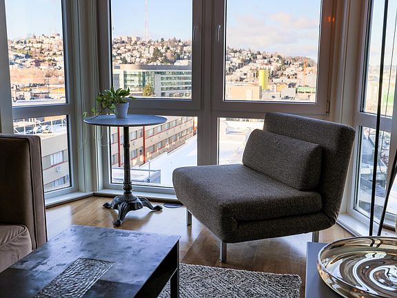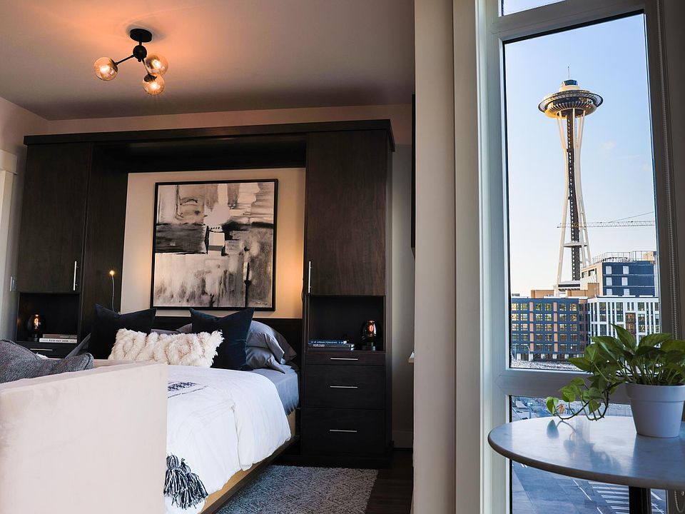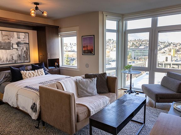 Fully-furnished and immaculate PENTHOUSE studio with sweeping unobstructed view of the Space Needle! Floor-to-ceiling windows, high-end Murphy bed, full bathroom, spacious closet, hardwood floors, granite countertops, stainless steel appliances, blackout roller shades, in-unit W/D, smart dishwasher, AC unit.