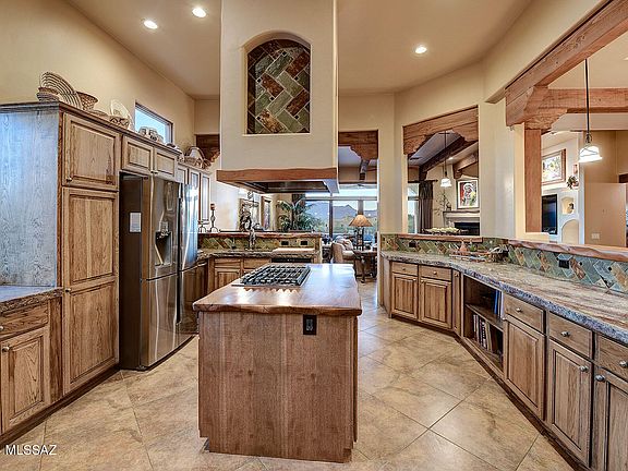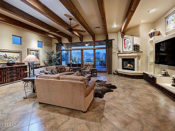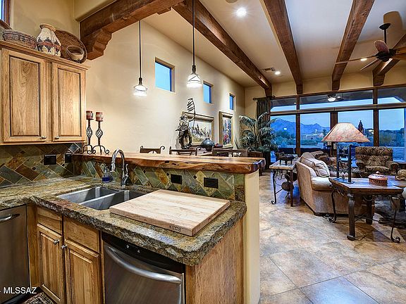 Sitting on a corner lot with the Santa Rita Mountains towering behind, this beautiful home epitomizes everything you have dreamed of for your new desert lifestyle. Beautiful architectural details add curb appeal and the front courtyard welcomes you in. The mountain views from every window will surely captivate guests as they enter the home! Soaring ceilings and walls of glass framing the views add drama to the great room. Wooden beams on the ceiling and a glowing fireplace add to the ambience. The kitchen is open to the great room and dining area, featuring stunning mesquite wood surfaces and scraped wood siding on perimeter walls. The center island is also mesquite and the counters are amazing with a natural edge slab granite. These rich and varied wood finishes in the kitchen and living areas give the home a luxurious and organic feel. Step outside to the patio where the views are truly panoramic! Back inside, your primary suite is spacious and has beautiful mountain views coming through the windows. A tiled walk in shower and large walk-in closet complete your retreat. A seperate, but still inside the home, "casita" has been added to this Anza model, featuring a living area, bedroom and bath which can be closed off behind double doors for complete privacy. Visiting family and friends will love this space, and it is perfect as a mother-in law suite. Another guest room and bath is currently being used as a den. If luxury, space, and mountain views are on the top of your wish list, you have found your dream home in the desert!