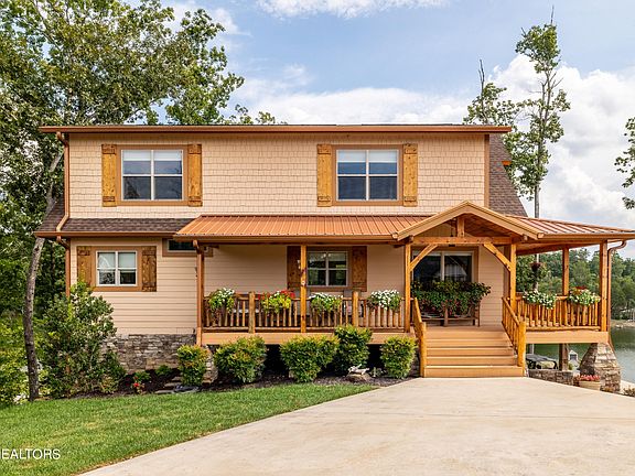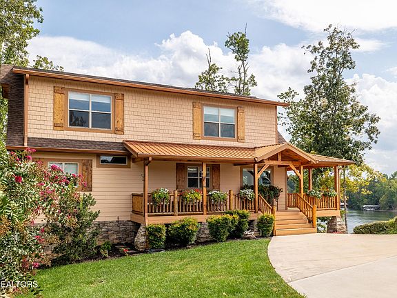 Absolutely stunning lakefront home on beautiful half acre setting, on a peninsula with water views in 2 directions up the desirable Pearl Harbor area of Watts Bar Lake! Only 7 years young, this home is located in a prestigious gated community surrounded by luxury homes. Custom designed and built by the original owners, who took great pains to achieve perfection with a perfect blend of rustic timberframe construction with natural heavy wood timber, combined with modern elements of neutrally painted drywall vs darker wood walls, with hardyboard exterior siding. A wonderful wraparound porch is sure to be a favorite feature! Note the extensive use of architectural windows throughout, to achieve an open concept with an abundance of natural light on each level. The open main level floorplan is well-suited for today's living style & comfort, with the gourmet cook's kitchen with granite island & custom cabinetry, all flowing into the living space that features a massive corner stone fireplace (modern electric logs for a clean energy warmth & appeal). Water views from all levels at most every point inside the home! A main level master adjoins the living space, offering a lavish tile bath with oversize tile shower, plus an adjoining laundry room right where you need it! Bonus: all furnishings are negotiable & can be included with this home, so no need to shop if this is a second home purchase! Your favorite space may be the covered back porch, which is more than roomy enough for seating and outdoor entertaining and offers breathtaking water views! The basement level offers a ''flex'' room that can be an office or 4th bedroom, plus a full bath! A basement workshop/storage space is very useful. This level also has a spacious 2-car side-entry garage. The gently sloping well-manicured wooded yard offers 174 feet of water frontage, and has a concrete drive in back for an easy walk down, or drive your golf cart or ATV to the dock & lake!