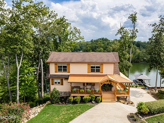 Absolutely stunning lakefront home on beautiful half acre setting, on a peninsula with water views in 2 directions up the desirable Pearl Harbor area of Watts Bar Lake! Only 7 years young, this home is located in a prestigious gated community surrounded by luxury homes. Custom designed and built by the original owners, who took great pains to achieve perfection with a perfect blend of rustic timberframe construction with natural heavy wood timber, combined with modern elements of neutrally painted drywall vs darker wood walls, with hardyboard exterior siding. A wonderful wraparound porch is sure to be a favorite feature! Note the extensive use of architectural windows throughout, to achieve an open concept with an abundance of natural light on each level. The open main level floorplan is well-suited for today's living style & comfort, with the gourmet cook's kitchen with granite island & custom cabinetry, all flowing into the living space that features a massive corner stone fireplace (modern electric logs for a clean energy warmth & appeal). Water views from all levels at most every point inside the home! A main level master adjoins the living space, offering a lavish tile bath with oversize tile shower, plus an adjoining laundry room right where you need it! Bonus: all furnishings are negotiable & can be included with this home, so no need to shop if this is a second home purchase! Your favorite space may be the covered back porch, which is more than roomy enough for seating and outdoor entertaining and offers breathtaking water views! The basement level offers a ''flex'' room that can be an office or 4th bedroom, plus a full bath! A basement workshop/storage space is very useful. This level also has a spacious 2-car side-entry garage. The gently sloping well-manicured wooded yard offers 174 feet of water frontage, and has a concrete drive in back for an easy walk down, or drive your golf cart or ATV to the dock & lake! Very nicely constructed metal roofed boat dock with lift!