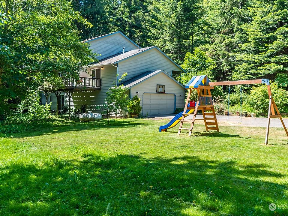 This serene 4.68-/+ acre home offers privacy and room to breathe, with easy access to Anacortes and Oak Harbor. Bring your ideas and a little TLC to make this your dream home! The main level provides a large kitchen, open living space w/pellet stove, utility room, dining room, family room and a 1/2 bath. The upper level boasts a nice primary w/ a spacious bathroom, two bedrooms and a 3/4 bath. There is a partially finished basement with a private entrance.