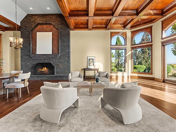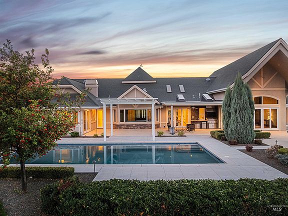 Introducing a spectacular estate, a once-in-a-lifetime opportunity on over 3 acres, towering above Boise Ranch Golf Course w/ panoramic views of the Treasure Valley & Boise Mountains. Situated within a gated enclave, this estate offers privacy, surrounded by lush landscaping, a grand resort-style pool & expansive driveway. Designed for the discerning buyer, the property features two 45-foot-deep RV bays & a sprawling 6,500+ sf of living space w/ vaulted box beam ceilings & impressive grand room w/ a stately brick fireplace. The gourmet kitchen is a chef’s dream, blending elegance & functionality, complemented by a sophisticated bar area perfect for entertaining. The lavish primary suite is a private oasis, featuring its own fireplace, expansive walk-in closet & patio access. A 2nd primary suite on the opposite wing offers stunning views & patio access. The enormous heated garage accommodates 8+ vehicles, w/ an office above. Impeccably updated- this first-time market offering promises to captivate.