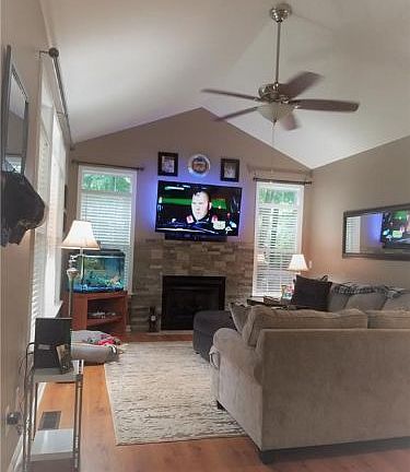 Meticulously maintained 3Br 2Ba home on an acre lot with cathedral ceilings in 3 rooms and 9 ft ceilings throughout. Laminated wood flooring in living areas, stainless appliances, gas log fireplace and double vanity. Rocking chair front porch and rear deck for entertaining. Fenced in back yard, out building and much more. Refrigerator remains.