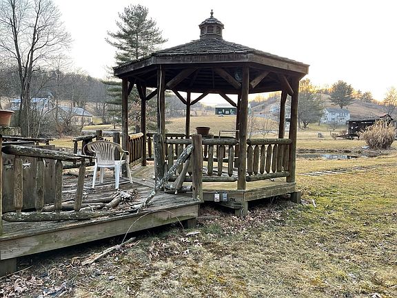 Fayette Township-Juniata County. Home includes 2 bedrooms, 1 full bath and laundry on 1st floor. Living room features stone fireplace and open floor plan flowing into office area. Spacious enclosed wrap-around porch and front deck. Property suitable for a starter home, retirement or camp area. Rural living with entertaining under pavilion or relax by the pond in Gazebo. Site on 4 acres.