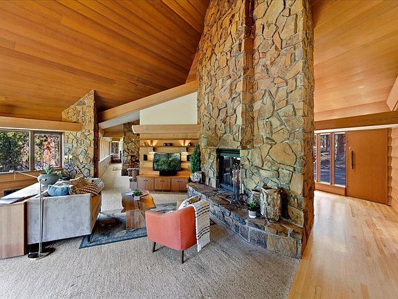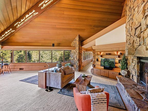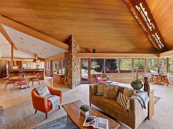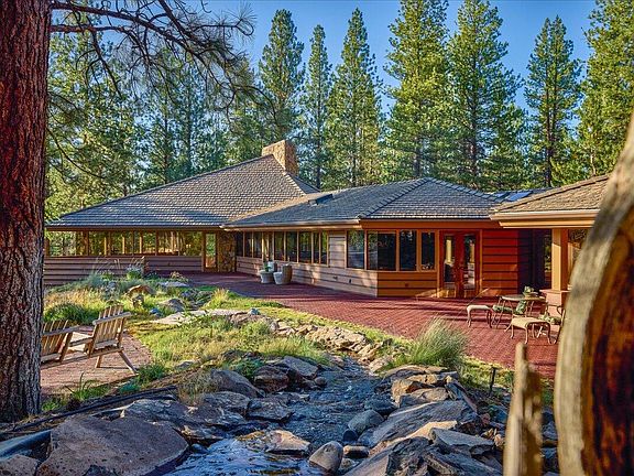 Stunning mid-century-style architectural masterpiece designed by Frank Lloyd Wright apprentice Milton Stricker. Located on 2 ½ acres in the premier equestrian community, Cascade Meadow Ranch, in Sisters, Oregon. Ranch amenities include secure gated access, community clubhouse, tennis courts, horse stalls, paddocks, indoor and outdoor arenas, and more. Every room embraces the outdoors: mountain views, a babbling brook water feature, expansive lawn, and landscape. This single-level open concept home features 3 bedroom suites, 2 fireplaces, family room, kitchen with high-end appliances (plus a steamer, warming drawer, and espresso machine), office/studio, wine cellar, indoor endless pool & dry sauna with shower, sunroom, laundry, 3-car garage + 2nd garage/workshop. A dramatic light fixture with a Cascade Mountain design motif transverses the great room vaulted ceiling. Constructed with clear cedar walls, mahogany built-ins, pecan floors, and Oregon Salishan stone.