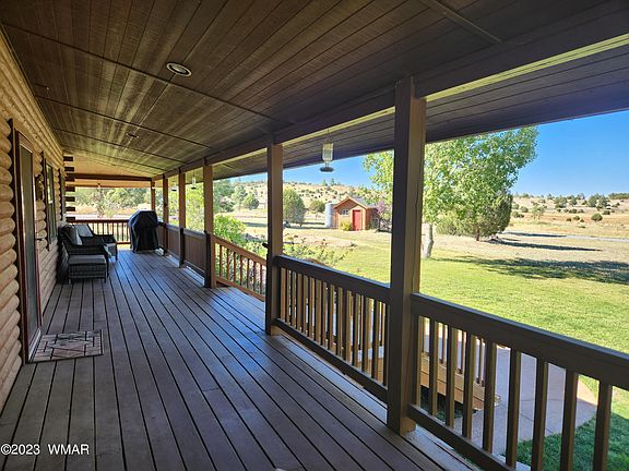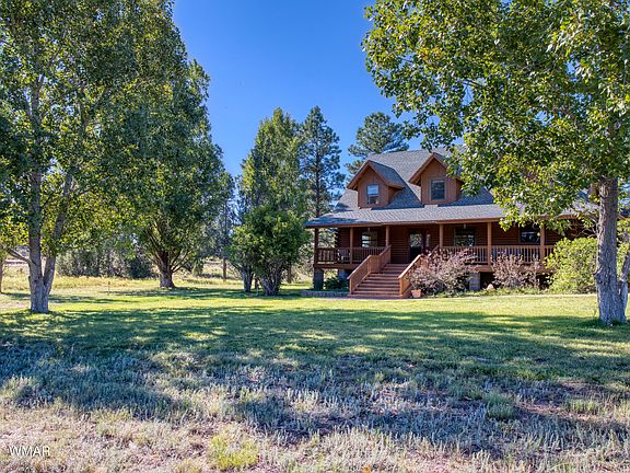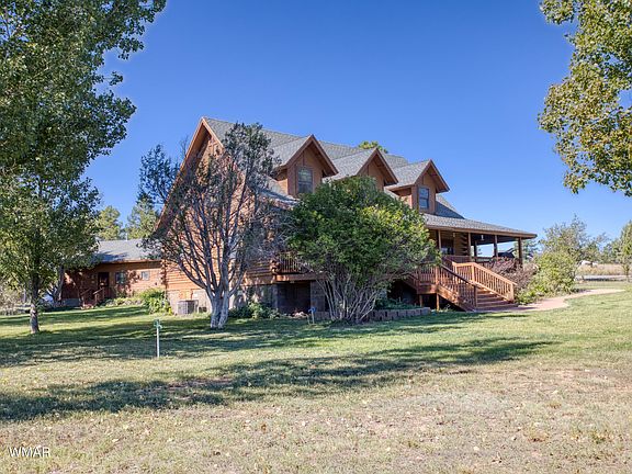 Mountain retreat Home with Guest House totaling 3,507 Sq Ft. 5 bed/3.5 bath. The Main House is a custom-built log cabin 2,751 Sq Ft - 3 beds/2.5 baths with a large Office/Den. The Guest House totaling 756 Sq Ft with 2 beds/1 bath. Both residents sit on 2.5 acres with a private well with --NO -- HOA/CC&Rs. The main house features: A covered wrap-around front deck, a beautiful front step entry, back deck, and a patio to enjoy the panoramic views. As you enter the home on the main floor, on the right side is the Office/Den (14'X11'), and on the left side is the master suite access. As you continue, you find yourself in the great room with a breathtaking loft overlooking the living area. As you navigate the main floor, your next stop to the right is a dream kitchen with high-end appliances, granite countertops, standalone breakfast area, half bath, laundry room, pantry with an exit door outside. The master suite has all the comforts you would expect, the bath has a huge walk-in shower with multiple heads, a solid slab of travertine for the dual sink countertop, his and hers walk-in closets, and an entire wall of built-in storage. Upstairs to the loft, the view from the lofty wood-clad ceilings looking down is breathtaking, flooded with lots of natural light. There, you have access to the two other bedrooms and a bath upstairs. In addition to the main house is the private guest house with separate parking, 2 bed/1 bath, central heating and air, full kitchen, and stacked laundry space. The guest house also makes a great rental.