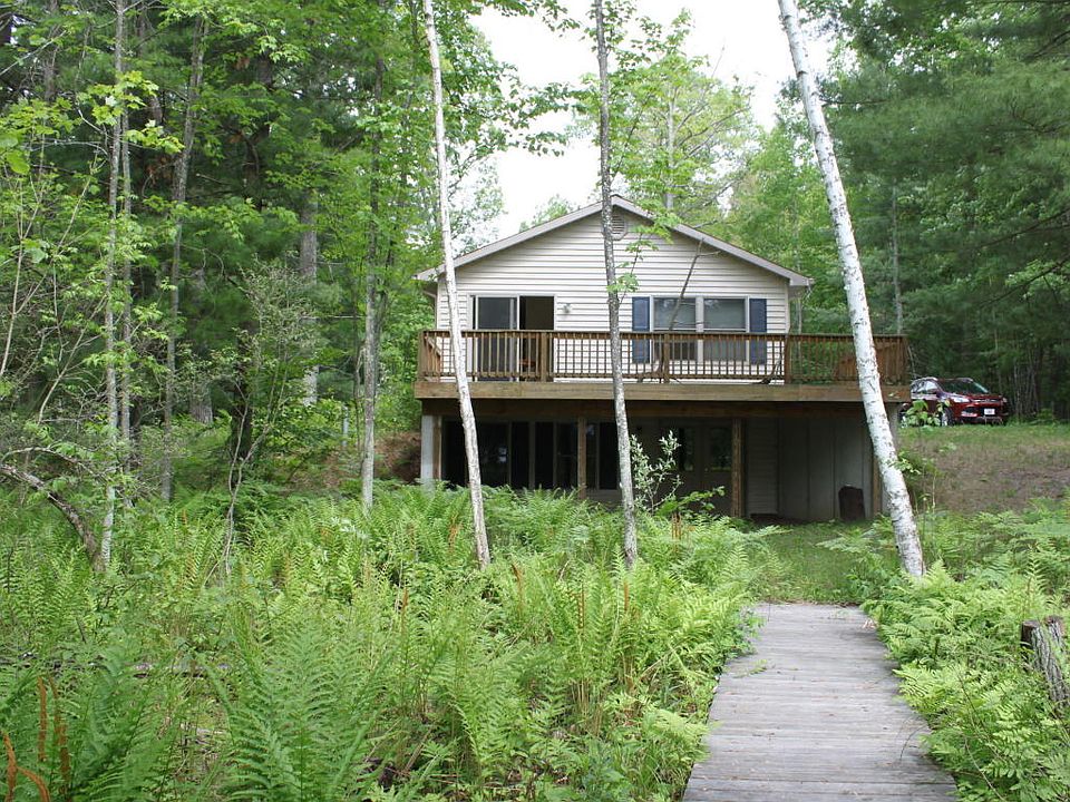 Well maintained newer 2 bedroom 2 bath home / cottage with 95' of Little Bass Lake frontage. The lot totals approximately 1.2 acres and is nicely wooded. The home comes furnished as is with the exception of the owners personals. This place was used as a summer cottage and shows little to no wear and tear. There is a full unfinished walkout basement to finish to your liking for extra room or for storage. Little Bass lake is 54 acres in size, all sports and reaches depths of 45' in some place s. In a good year you can canoe from Little Bass Lake to Big Bass.