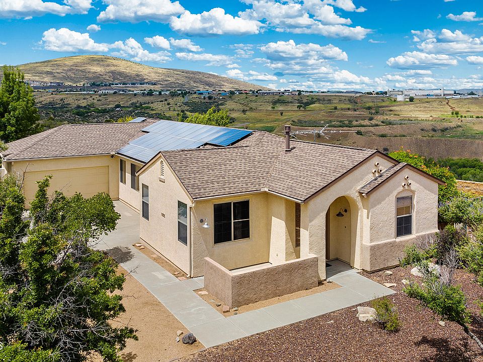 One of a kind, single level Stoneridge Home with Mountain Views! Nestled in the sought-after Stoneridge golf community, this beautifully appointed home offers panoramic views and amenities galore. With 1,701 square feet of single-level living space, the floorplan features 3 spacious bedrooms, 2 updated bathrooms, and an attached 2-car garage. The home sits on a large 1/3 acre lot, providing privacy and plenty of room to relax outdoors. From the elevated back deck, take in sweeping vistas of the Mingus Mountains and Glassford Hill while enjoying brilliant sunsets. Gather with friends and family to watch 4th of July fireworks and the magical Holiday Valley of Lights. Inside, new luxury vinyl plank flooring flows throughout the home. Solar owned. Close to trails, fitness center, pools, golf.