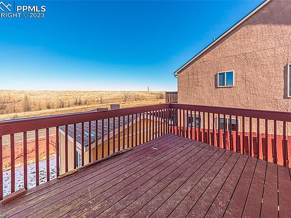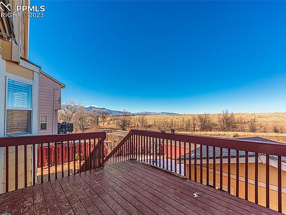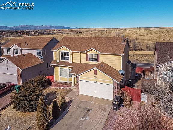 Don't miss your opportunity to own this beautiful, large 2 story home with 6 bedrooms, 3.5 bathrooms and beautiful unobstructed views of Bluestem Prairie Open Space and Pikes Peak from the back deck. When you walk into the home, you can see the open views through all the rear windows. Large formal dining room! Kitchen includes slab granite counters and stainless steel appliances. The kitchen opens to the inviting family room with a beautiful gas fireplace. The living and family rooms have new wood laminate floors. Smart home features control the front door lock, kitchen lights, family room TV (included) and garage. Four bedrooms upstairs. The primary bedroom is large with a huge walk-in closet and 5-piece bath. Finished walkout basement boasts an additional family room with a wet bar, two additional conforming bedrooms and a beautiful full bathroom. The furnace and water heater are approximately 1 year old! Central AC! Washer and dryer on the main level are included. Four hardwired security cameras for outdoor security (they work even when wi-fi goes out). Large 12 X 12 storage shed in the back yard. Storage shelves and overhead storage in the garage are also included. This is a TURN KEY home. Just move in. King Elementary School is just two blocks south!