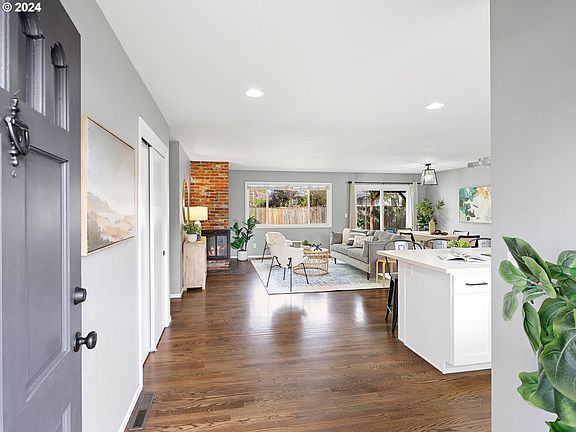 Step into this meticulously maintained Mid-Century gem, where the classic allure of 1960s architecture seamlessly blends with contemporary upgrades! Original hardwood floors (bedrooms recently refinished) grace the majority of this one-level abode, offering both durability and a touch of timeless beauty that only improves with age. Entertaining is a breeze in the open floor plan, with a stunning brick fireplace creating a cozy ambiance for gatherings year-round. Indulge your culinary passions in the remodeled kitchen, boasting stainless steel appliances, sleek quartz countertops, and a sprawling eat bar/island, perfect for casual dining or hosting parties. Need extra space? The bonus room offers endless possibilities! Think larger primary suite where you could turn the half bath into a walk-in closet and full bath ensuite creating another bedroom in the home. Other ideas are a home office, media room, or hobby area. Outside, enjoy the covered patio for alfresco dining and a charming shed for additional storage. Nestled in a sought-after SW PDX neighborhood, this home is in very close proximity to the serene Fanno Creek Trail, offering both tranquility and convenience. With new exterior paint, a large corner lot with mature trees & fully fenced backyard, this turnkey property is ready for you to move in and start making memories. Don't miss out on the opportunity to own this meticulously crafted masterpiece in an unbeatable location!