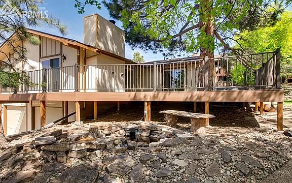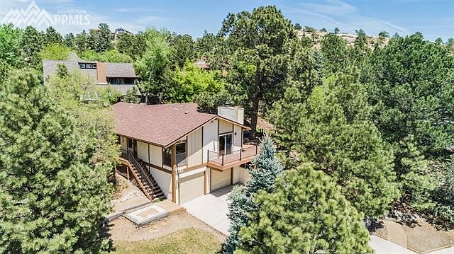 Stellar corner wooded lot with water feature, hot tub, huge composite deck which wraps around to the front of the house in a very private setting. Amazing views of Pikes Peak and mountain range. Freshly painted interior, refinished wood floors in entry, kitchen & eating nook, cabinet pantry, counter bar. ALL bathrooms remodeled. Great room has stone wood burning fp, walkout to deck. Formal dining room with crown molding. Lower level rec room with built in cabinets, pool table with accessories, office/den, guest bdrm/bath. Main level laundry and lower level laundry hookups. 2017 Water heater, 2013 roof. Move in ready home.