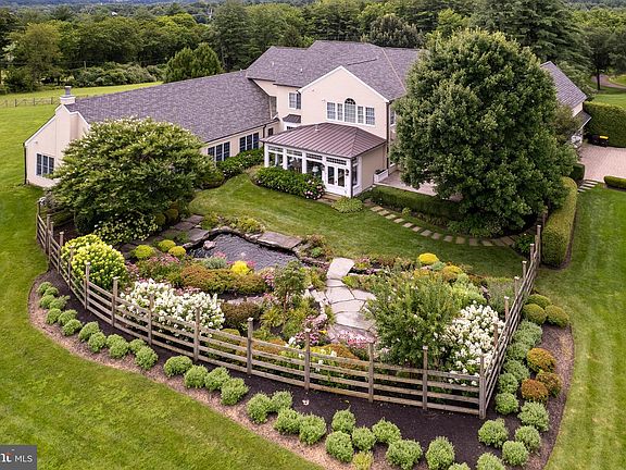 A winding driveway carves through almost ten acres of verdant scenery, arriving at a Bucks County Fieldstone home that feels plucked from a dreamscape. This custom-built beauty tucked quietly in the Solebury countryside, blends pastoral charm with refined grandeur offering a true sanctuary for the nature-loving aesthete. Inside, craftsmanship reigns supreme. Soaring ceilings on the main level pair with Brazilian cherry floors and extravagant millwork to set a tone of understated luxury. The two-story foyer, clad in marble and anchored by a sweeping staircase, makes a theatrical first impression. The gourmet kitchen is outfitted with soapstone countertops and Subzero and Viking appliances and warmed by a stone fireplace in the adjacent breakfast nook. A light-filled sunroom connects seamlessly to the great room, offering year-round views of the gardens and waterfall-fed pond. A first-floor guest suite and dedicated home office are tucked into a private wing. Upstairs, four en suite bedrooms extend hospitality and comfort, none more indulgent than the light-filled primary suite complete with a private sitting area, spa-inspired bath, and expansive walk-in closets worthy of a designer’s eye. An Adirondack-style indoor pool and spa wrapped in timber-lined cathedral ceilings and anchored by a wood-burning fireplace offers four-season relaxation. Auto enthusiasts will appreciate the eleven deep garage bays with epoxy flooring beneath a lovely carriage house. A heated pole barn with groundskeeping storage spaces offers endless possibilities for recreation. And when a night on the town calls, the galleries, theater, and dining of New Hope are only minutes away.