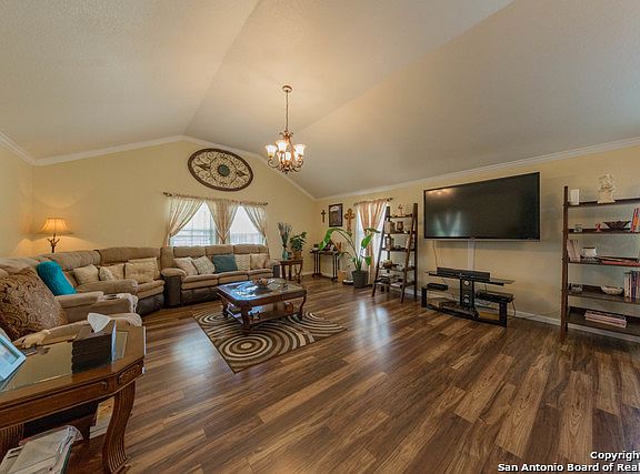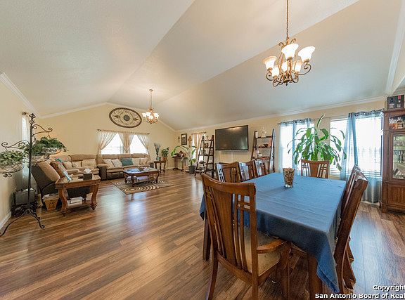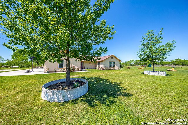 San Antonio Riverfront & backyard paradise on 10 acres* Ranch Style home boasts an open concept w/3 brdms, 2 bths, large living & dining area, custom cabinetry, granite island, gas cooking, crown molding & extra large bdrms. Pergola, detached shed, work shop & office/craft room w/air conditioning. Detached covered pavilion w/ built-in grills & outdoor kitchen equipped w/sink & built-in refrigerator/ice maker. Two outdoor restrooms one w/shower. Horses & livestock welcome. Easy access to HWY 181, I37 & 1604